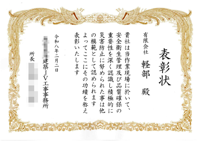 建築測量(墨出し)業務をご依頼いただいている建築工事事務所様より、表彰を賜りました。